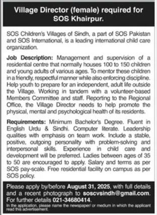 Vacancies in SOS Children Village of Pakistan Advertisement August 2025