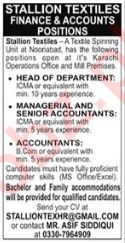 Vacant posts including managerial accountant, head of department and accountant are announced in Stallion Textiles Karachi, karachi Sindh Pakistan as per 23 July 2023 advertisement in daily The News Newspaper. Preferred Education is Bachelor, MS, Master and B.com etc.