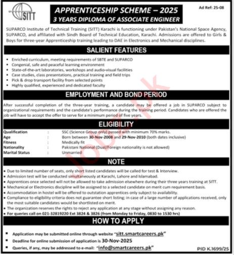 SUPARCO Institute of Technical Training SITT latest Government Engineering jobs and others can be applied till 30 November 2025 or as per closing date in newspaper ad. Read complete ad online to know how to apply on latest SUPARCO Institute of Technical Training SITT job opportunities.