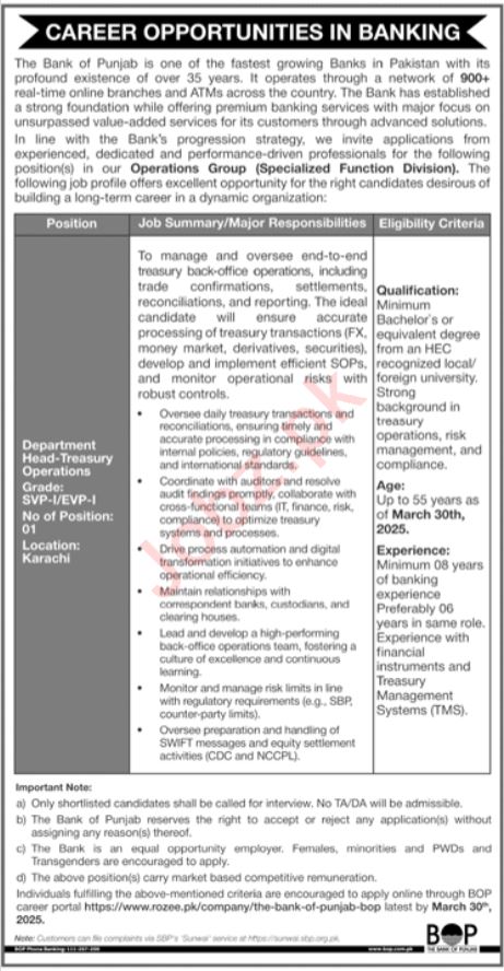The Bank of Punjab BOP Ghani Chowrangi Karachi, karachi Sindh Pakistan invites applications from eligible candidates for the post of department head treasury operations as per advertisement of March 17, 2025 published in daily Jang Newspaper. Master, MS and Bachelor etc. educational qualification will be preferred.