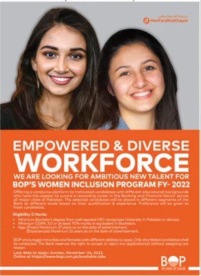 The Bank of Punjab BOP jobs advertisement dated about 25 October 2022 in daily Jang Newspaper invites application for the vacant post of women inclusion program fy in Lahore, lahore Punjab Pakistan. Educational qualifications required Bachelor and Master etc.