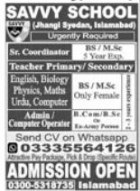Vacant posts including sr coordinator, admin computer operator, teachers secondary and primary teachers are announced in The Savvy School Jhang Syedan Islamabad, islamabad Islamabad Pakistan as per 11 August 2025 advertisement in daily Jang Newspaper. Candidates with B.com, M.sc, Bachelor and Master etc. educational background will be preferred.
