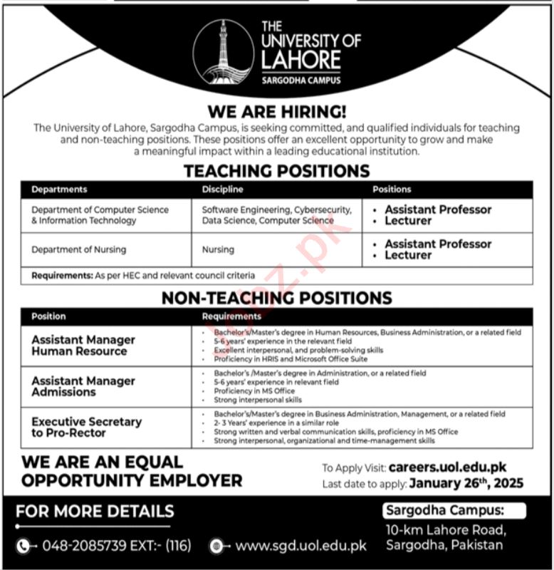 The University of Lahore UOL jobs advertisement dated about 12 January 2025 in daily Jang Newspaper invites application for the vacant post of executive secretary to pro rector, lecturer, assistant manager admission, assistant manager human resource and assistant professor in Sargodha, sargodha Punjab Pakistan. Educational qualifications required Bachelor, Master, Phd and Mphil etc.
