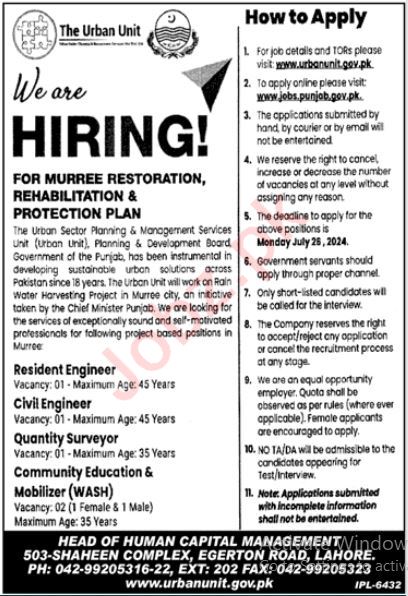 The Urban Unit jobs advertisement dated about 7 July 2024 in daily Jang Newspaper invites application for the vacant post of helper, supervisor, driver and site engineer in Lahore, lahore Punjab Pakistan. Middle, Intermediate, Matric and Bachelor etc. educational qualification will be preferred.