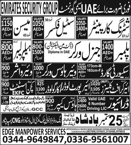 Badshah Trade Test Center UAE, uae UAE invites applications from eligible candidates for the post of Ekfc Kitchen Assistant, Cargo Loader, Helper Labor, Ware Washer, Duct Man, Electrician, Shuttering Carpenter, Security Guard, Plumber, Airport Loader, House Keeper, Warehouse Worker, Aircraft Cleaner, Mason, Driver, Kitchen Assistant, Steel Fixer and General Worker as per advertisement of September 22, 2025 published in daily Express Newspaper. Preferred Education is Middle, Matric and Intermediate etc.