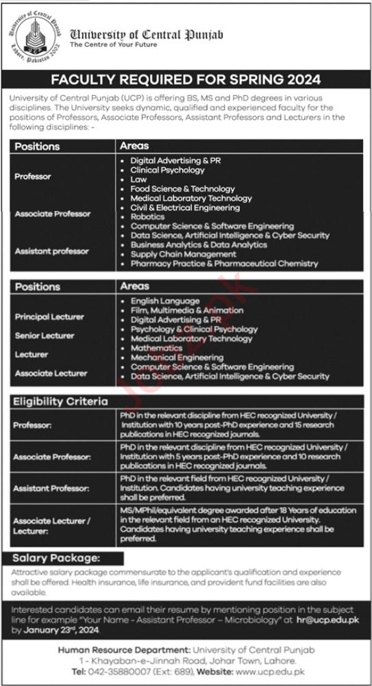 Vacancies in University of Central Punjab Advertisement January 2024