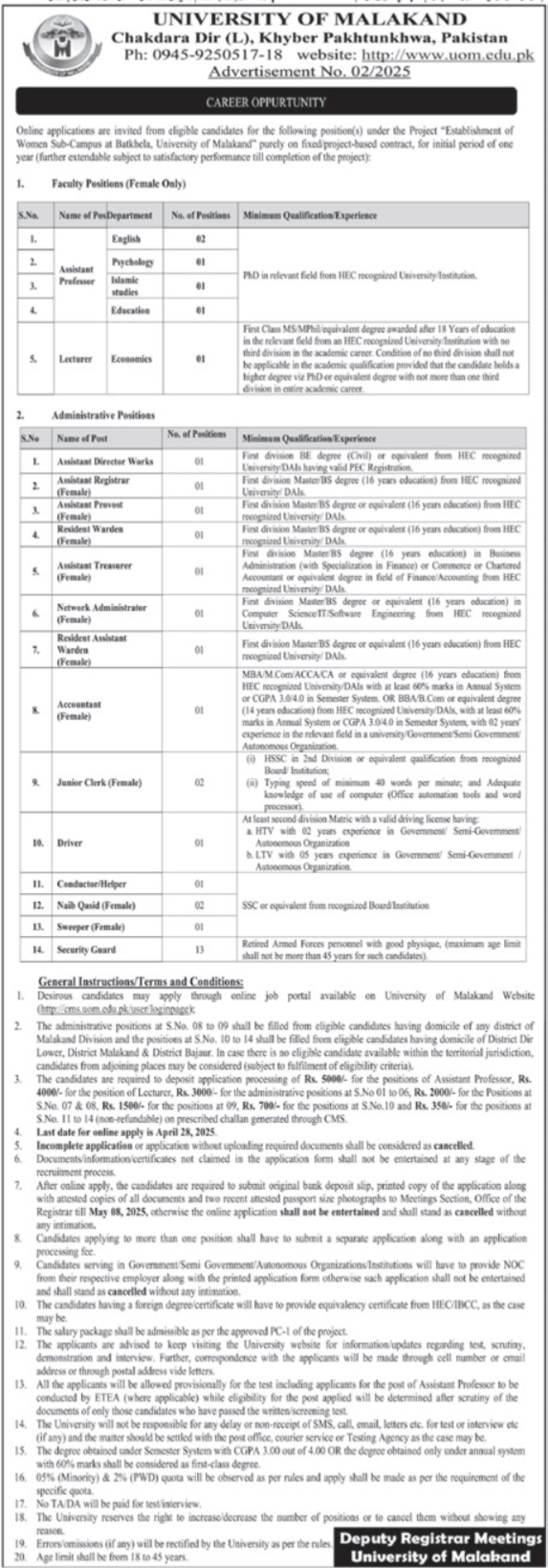 Vacancies in University of Malakand Advertisement April 2025