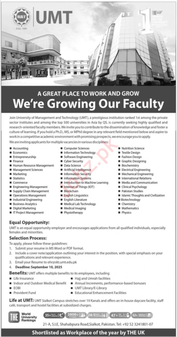 University of Management and Technology jobs advertisement dated about 17 August 2025 in daily Jang Newspaper invites application for the vacant post of faculty members, Professor, Lecturer and Visiting Faculty in Lahore, lahore Punjab Pakistan. Persons with Mphil, Phd and MS etc. education can apply.