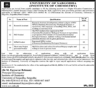 Vacant posts including research assistant, short term project personnel, worker, phd student and mphil student are announced in University of Sargodha UOS Sargodha, sargodha Punjab Pakistan as per 21 January 2025 advertisement in daily The News Newspaper. Preferred Education is MS, Master and Bachelor etc.