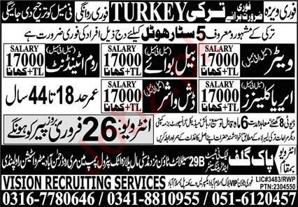Vacant posts including Waiter, Room Attendant, Area Cleaner, Dish Washer, Bell Boy and Maid are announced in Vision Recruiting Services Ankara, ankara Turkey as per 26 February 2024 advertisement in daily Express Newspaper. Preferred Education is Matric, Intermediate and Middle etc.