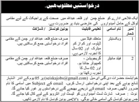 Vacant posts including field monitor and vaccinator are announced in Welfare Organization Killa Abdullah, killa abdullah Balochistan Pakistan as per 1 June 2025 advertisement in daily Jang Newspaper. Preferred Education is Intermediate and Bachelor etc.