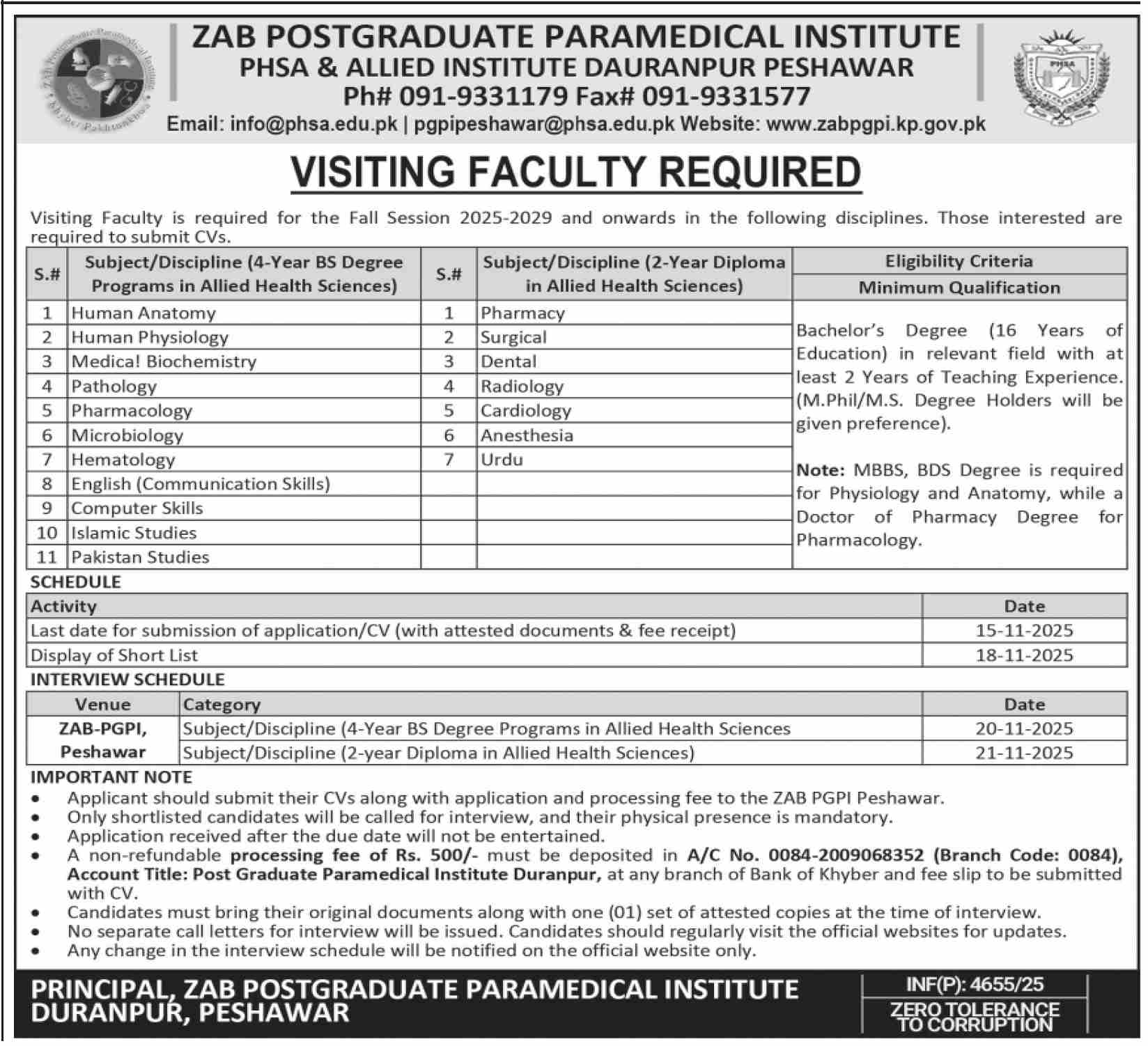 Vacant posts including visiting faculty, lecturer and professor are announced in Zab Postgraduate Paramedical Institute Peshawar, peshawar Khyber Pakhtunkhwa KPK Pakistan as per 6 November 2025 advertisement in daily Dawn Newspaper. Persons with Mphil, Bachelor, Master, MBBS and Phd etc. education can apply.