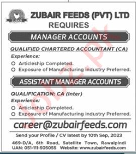 Zubair Feeds Private Limited jobs advertisement dated about 27 August 2023 in daily Jang Newspaper invites application for the vacant post of manager account and assistant manager accountant in Rawalpindi, rawalpindi Punjab Pakistan. Persons with CA, Bachelor, MS and Master etc. education can apply.