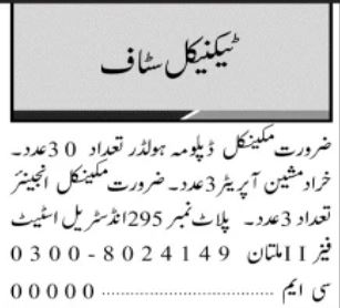 Private Industry jobs advertisement dated about 5 January 2022 in daily Jang Newspaper invites application for the vacant post of Engineer, Lathe Machine Operator, Mechanical Engineer in Multan Punjab Pakistan. Persons with Matric, Intermediate etc. education can apply.
