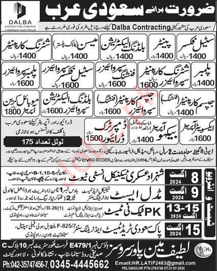 Vacant posts including dumper truck driver, building electrician, mason, mobile crane operator, painter, gypsum carpenter, back hoe operator, plumber supervisor, building electrician supervisor, plumber, finishing supervisor, steel fixer, excavator operator, steel fixer supervisor, gypsum carpenter supervisor and shuttering carpenter are announced in Latif Manpower Services Riyadh, riyadh Saudi Arabia as per 5 August 2024 advertisement in daily Express Newspaper. Preferred Education is Matric, Middle, Intermediate and Primary etc.