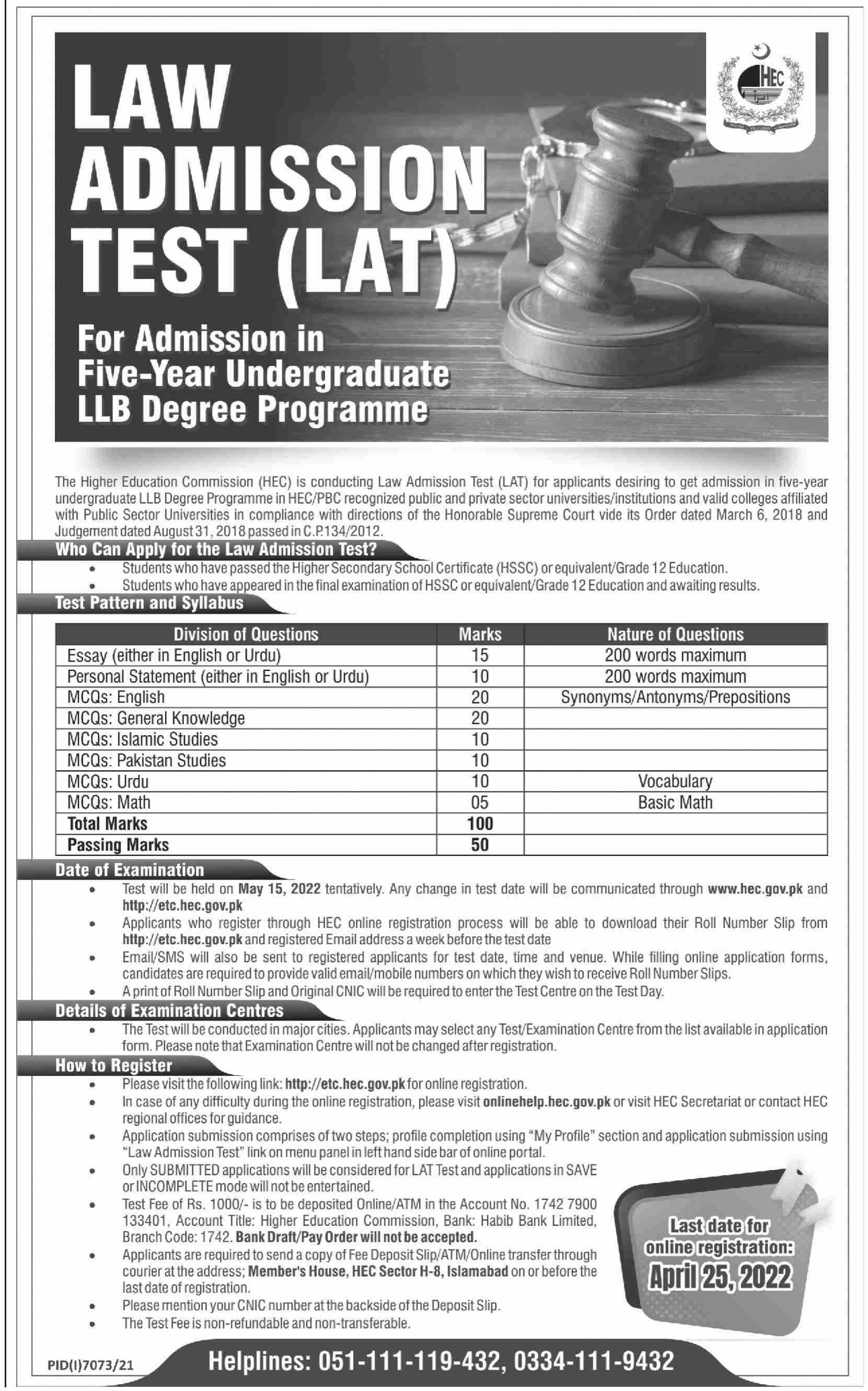 Higher Education Commission HEC Law Admission Test LAT admissions 2022 has been started. Higher Education Commission HEC Islamabad Islamabad Pakistan welcomes students to apply for admissions in academic year 2022 in Law University. Eligible students for fulfilling criteria for admissions in LLb can enroll as per Government admission policy 2022 till closing date 25 April 2022. Read newspaper ad for exact details.
