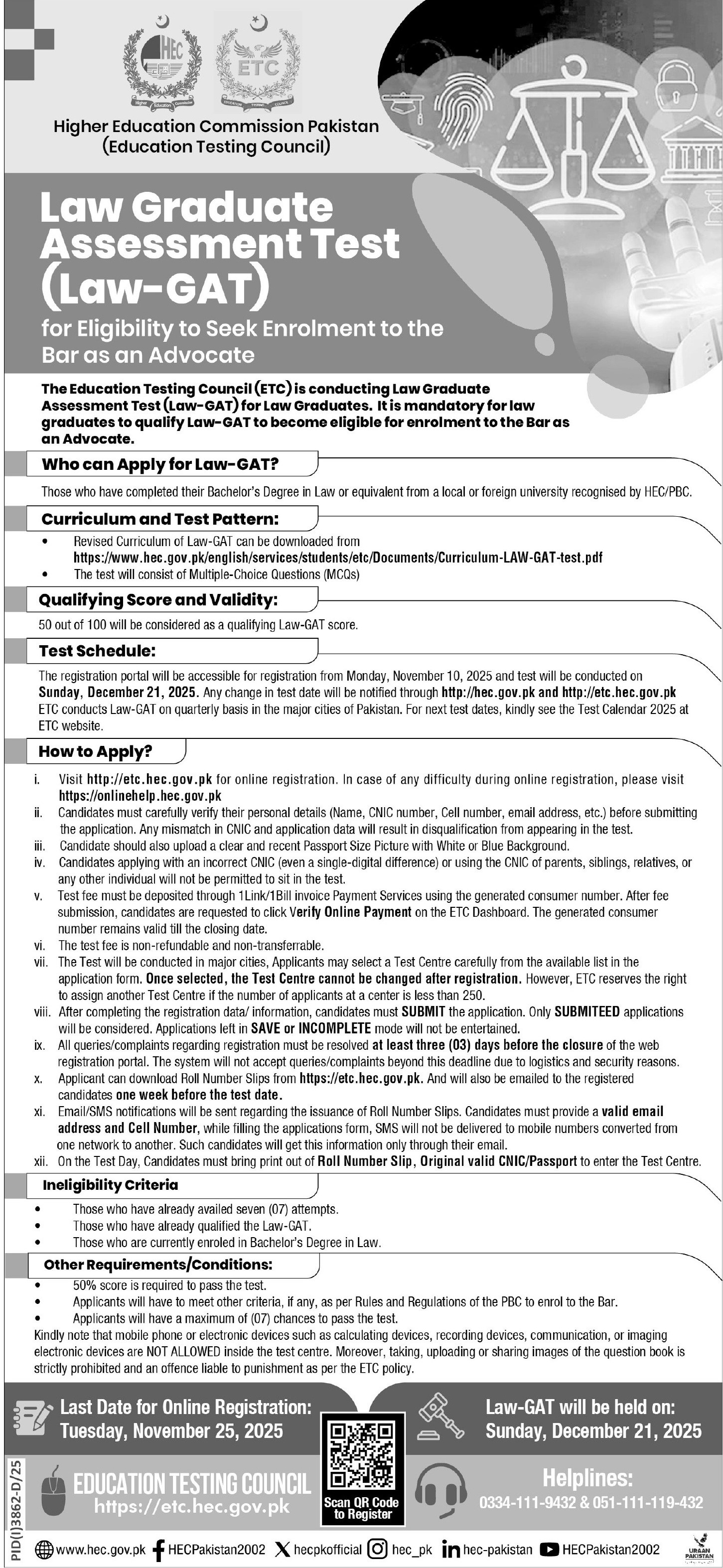 Vacant posts including law graduate assessment test are announced in Higher Education Commission HEC Islamabad, islamabad Islamabad Pakistan as per 9 November 2025 advertisement in daily Express Tribune Newspaper. Preferred Education is LLb etc.