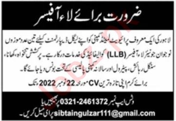 Vacant posts including law officer are announced in Private Company Lahore, lahore Punjab Pakistan as per 13 November 2022 advertisement in daily Dunya Newspaper. Preferred Education is LLb etc.
