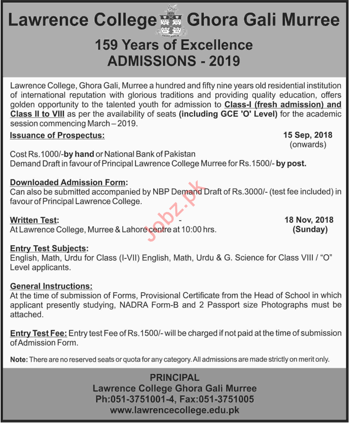 Lawrence College Ghora Gali Murree offers golden opportunity to the talented youth for admission to Class-I and Class II to VIII including GCE O-Level for the academic session commencing March - 2018. Read newspaper ad for exact details.