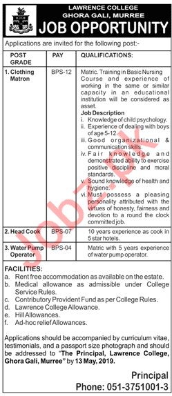 Vacancies in Lawrence College Ghora Gali Advertisement May 2019
