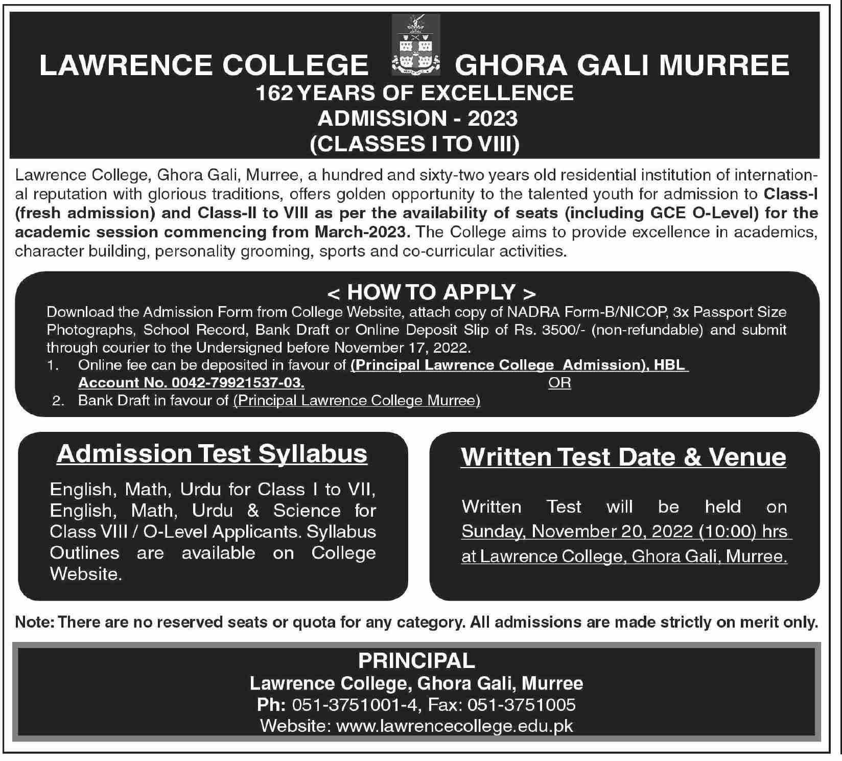 Lawrence College Ghora Gali Class 1 to 8th Class, Middle, Primary admissions 2022 has been announced. Eligible students who qualify as per admission criteria in Lawrence College Ghora Gali Murree Punjab Pakistan can apply in Science School for academic year 2022. Eligible students for fulfilling criteria for admissions in Middle and Primary can enroll as per Government admission policy 2022 till closing date 20 November 2022. Read newspaper ad for exact details.