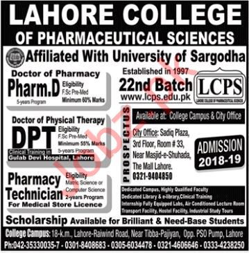 Lahore College of Pharmaceutical Sciences LCPS Lahore, Pakistan are opened admissions fall 2018 for the classes of Pharm D, DPT (Doctor of Physical Therapy), Pharmacy Technician. Read newspaper ad for exact details.