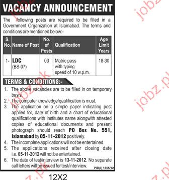 LDC Job Opportunity In Government Organization, Islamabad