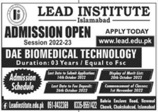 Lead Institute Islamabad DAE Biomedical Technology Admissions 2022