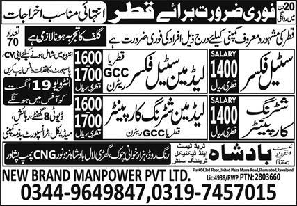 BTTC Badshah Overseas Employment Promoters invites applications for job positions advertised in daily Express dated 17 August 2024 for following vacancies in Doha, doha Qatar.