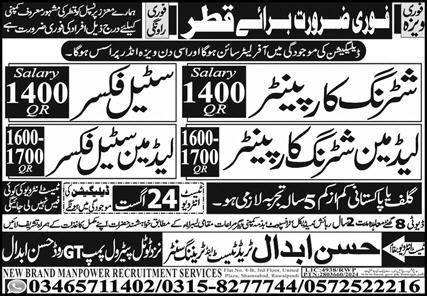 Hassan Abdal Trade Test & Training Center jobs advertisement dated about 21 August 2024 in daily Express Newspaper invites application for the vacant post of lead man steel fixer, lead man shuttering carpenter, shuttering carpenter and steel fixer in Doha, doha Qatar. Preferred Education is Intermediate and Matric etc.
