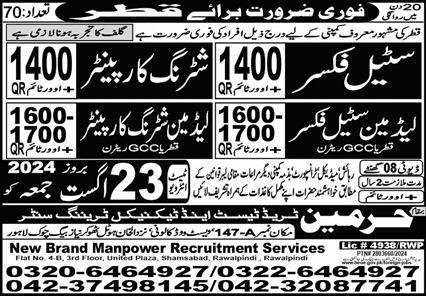Vacant posts including lead man steel fixer, shuttering carpenter, steel fixer and lead man shuttering carpenter are announced in Harmain Trade Test & Technical Training Center Doha, doha Qatar as per 20 August 2024 advertisement in daily Express Newspaper. Preferred Education is Middle, Intermediate and Matric etc.