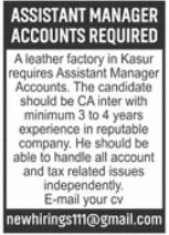 Vacant posts including assistant manager accounts are announced in Factory Kasur, kasur Punjab Pakistan as per 8 May 2022 advertisement in daily Jang Newspaper. Candidates with CA and Master etc. educational background will be preferred.
