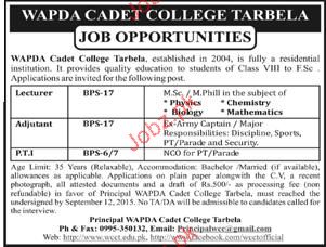 Lectuers, Adjutant and PTI Job in WAPDA Cadet College