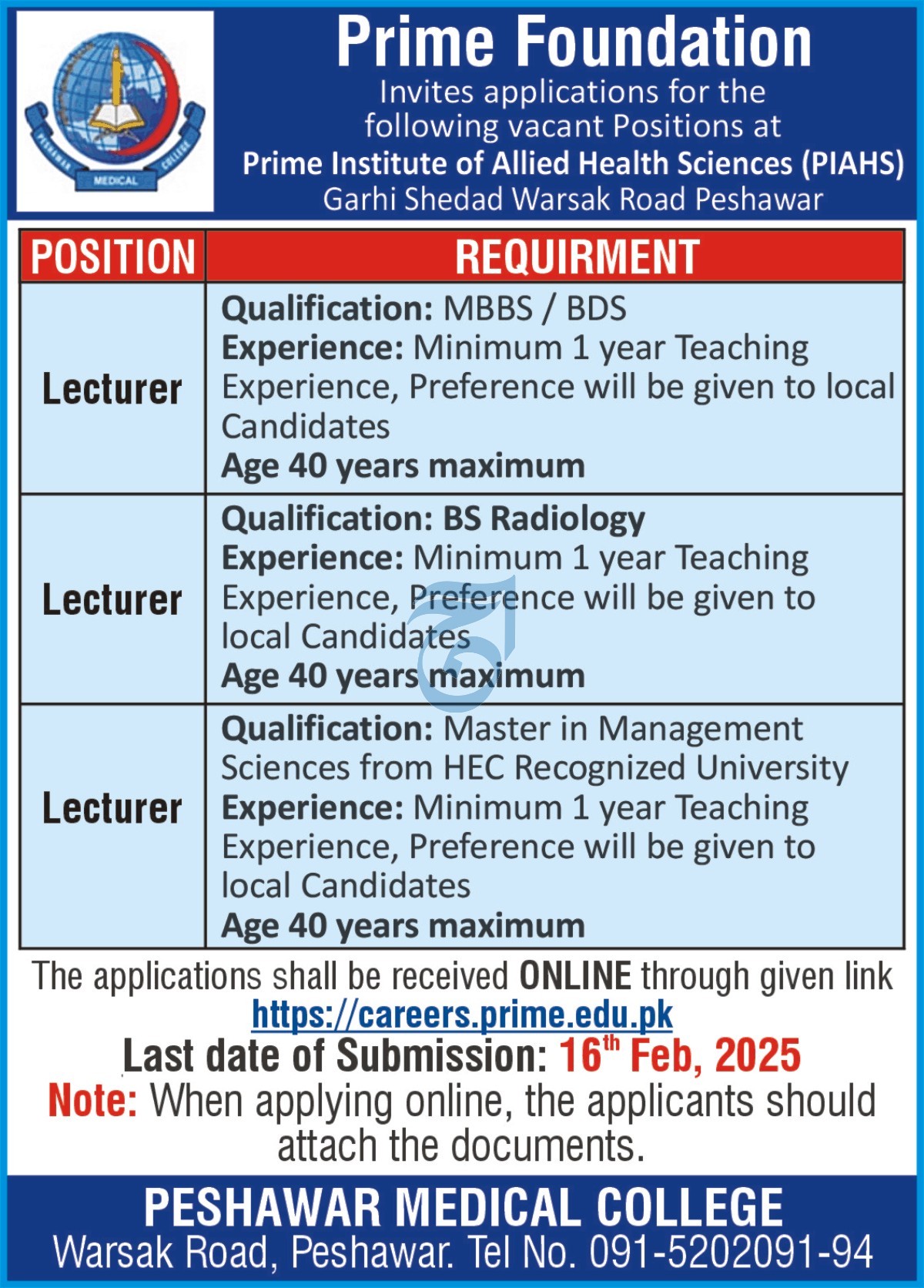 Vacant posts including lecturer are announced in Prime Foundation Peshawar, peshawar Khyber Pakhtunkhwa KPK Pakistan as per 9 February 2025 advertisement in daily Aaj Newspaper. Candidates with MBBS, Master and BDS etc. educational background will be preferred.