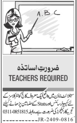 private college jobs advertisement dated about 24 September 2024 in daily Jang Newspaper invites application for the vacant post of lecturer computer science and lecturer stats in Rawalpindi, rawalpindi Punjab Pakistan. Candidates with Master and Mphil etc. educational background will be preferred.