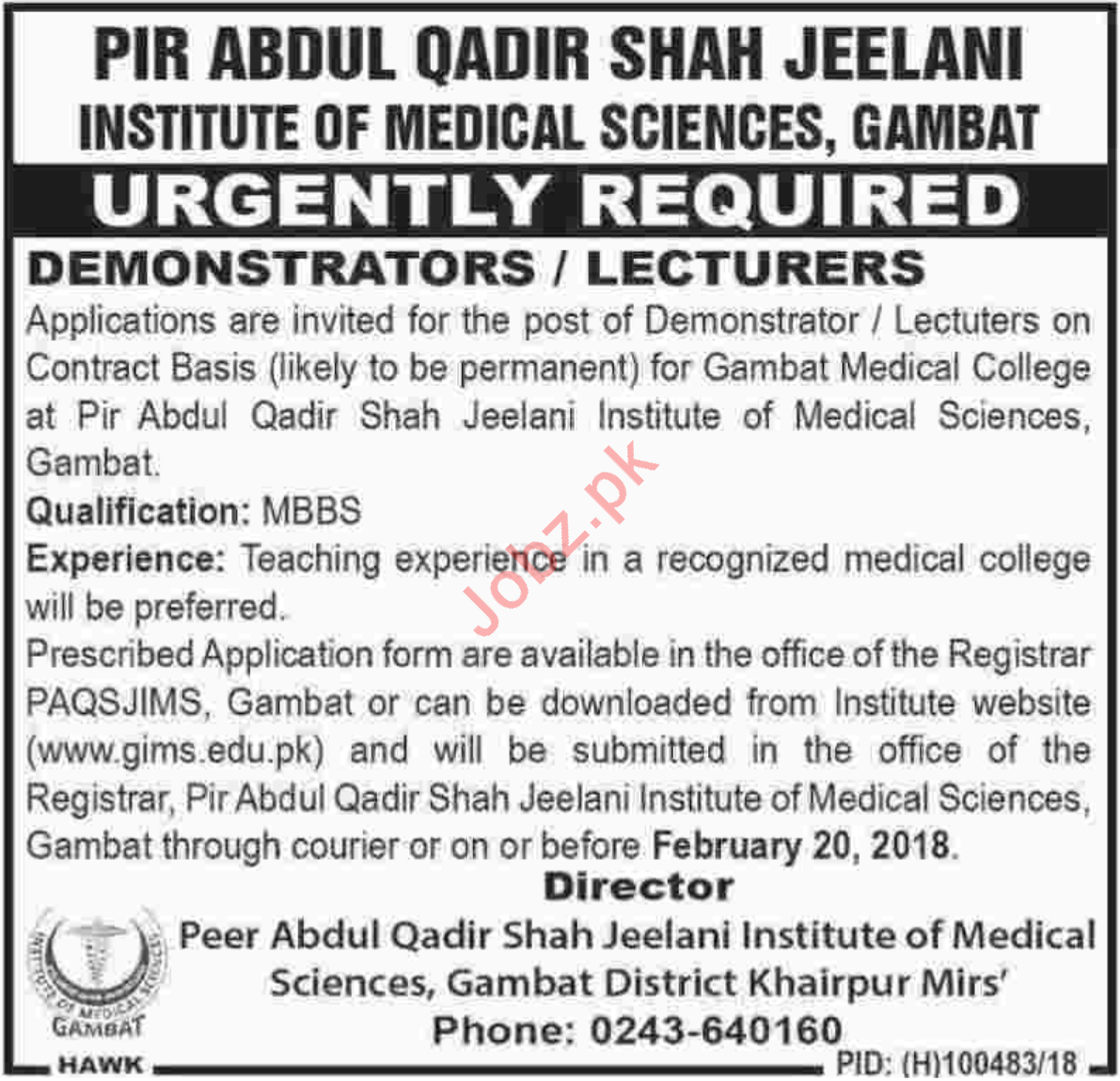 Latest Pir Abdul Qadir Shah Jeelani Institute of Medical Sciences Teaching Posts Khairpur 2025