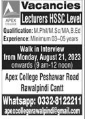 Vacant posts including urdu lecturer, physics lecturer, lecturer, chemistry lecturer, biology lecturer, computer lecturer and english lecturer are announced in APEX College Rawalpindi, rawalpindi Punjab Pakistan as per 20 August 2023 advertisement in daily Jang Newspaper. Preferred Education is Master, MS, Mphil and Phd etc.