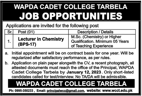 Wapda Cadet College Tarbela jobs advertisement dated about 3 January 2023 in daily Aaj Newspaper invites application for the vacant post of lecturer and chemistry lecturer in Tarbela, tarbela Khyber Pakhtunkhwa KPK Pakistan. Preferred Education is M.sc and Master etc.
