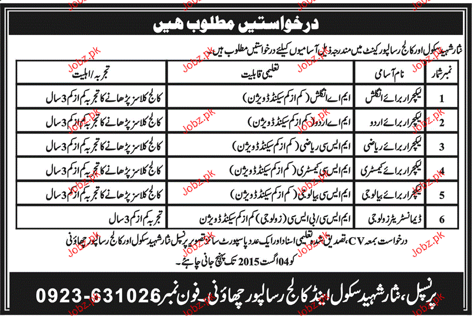 Lecturers Job In Nisar Shaheed School And College Risalpur