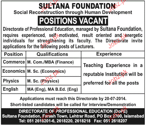 Lecturers Job In Sultan Foundation