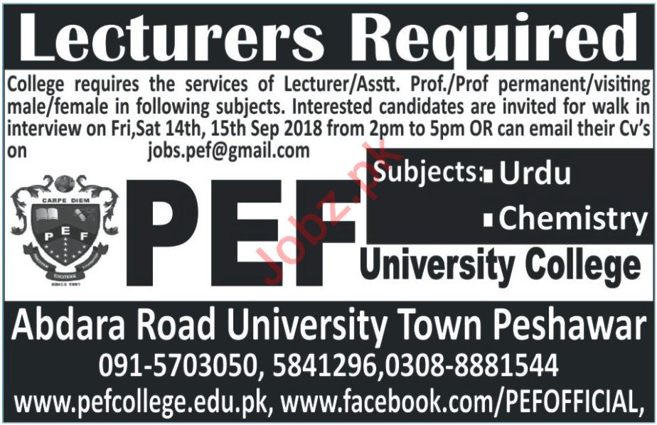 Lecturers Jobs 2018 For College In Peshawar KPK