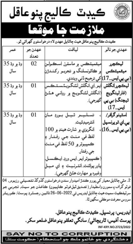 Vacancies in Cadet College Pano Aqil Advertisement June 2022