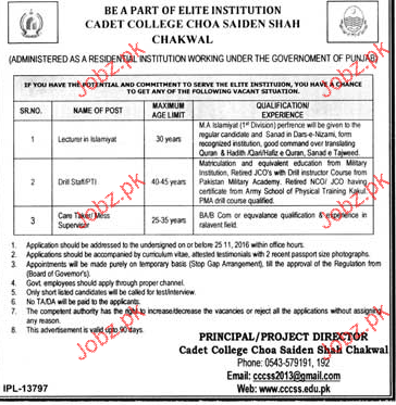 Lecturers, PTIs And Care Takers Job In Cadet College