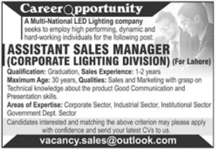 Vacant posts including assistant sales manager are announced in LED Lights Company Lahore, lahore Punjab Pakistan as per 12 June 2022 advertisement in daily Jang Newspaper. Bachelor and Master etc. educational qualification will be preferred.