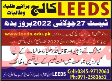 Leeds College has announced admissions 2022 for Intermediate Part I, FSc Pre Medical, FSc Pre Engineering, ICS Computer Science, . Eligible students who qualify as per admission criteria in Leeds College Peshawar Khyber Pakhtunkhwa KPK Pakistan can apply in Science College for academic year 2022. Eligible candidates for admissions in Intermediate and ICS can apply as per Private institute criteria and before closing date 22 July 2022 after reading advertisement online. Read newspaper ad for exact details.