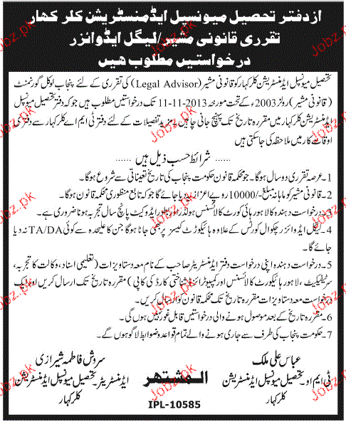 Legal Adviser Job In Tehsile Municipal Administration