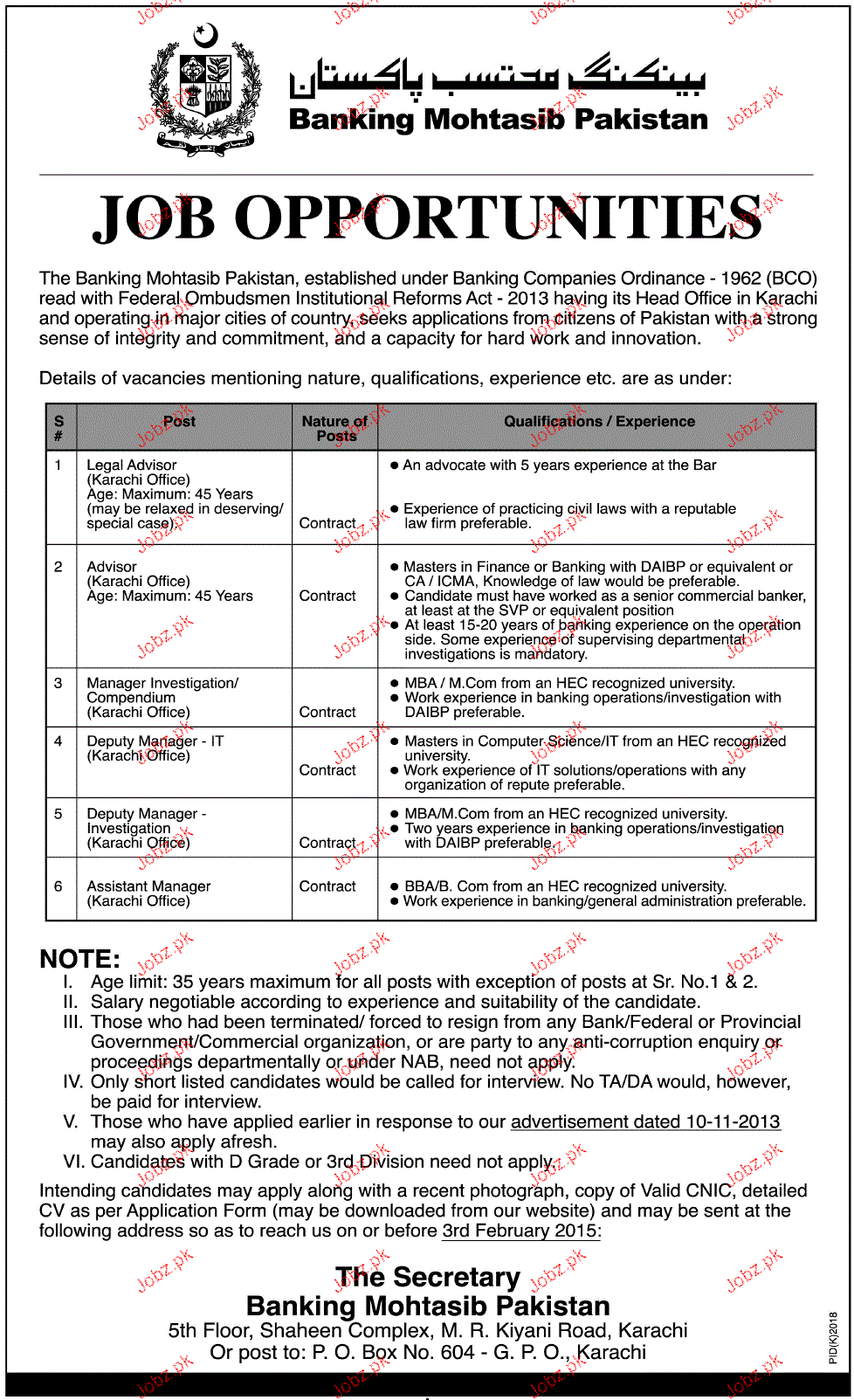 Apply as per details in job advertisement. Login to view further details of how to apply via https://www.jobz.pk online.