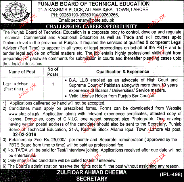 Legal Advisers Job In Punjab Board Of Technical Education