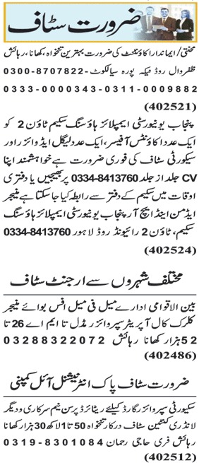 Private Company Lahore, lahore Punjab Pakistan invites applications from eligible candidates for the post of security staff, clerk, security supervisor guard, legal advisor, supervisor, accounts officer, manager, laundry canteen staff, accountant, office boy and call operator as per advertisement of August 10, 2024 published in daily Nawaiwaqt Newspaper. Educational qualifications required Bachelor, Intermediate, B.com, LLb, Matric, ACCA, BBA and Middle etc.