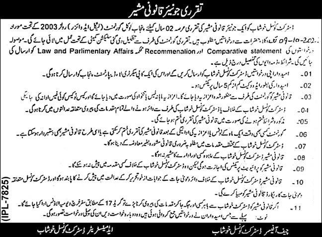 District Council jobs advertisement dated about 22 September 2023 in daily Nawaiwaqt Newspaper invites application for the vacant post of legal advisor in Khushab, khushab Punjab Pakistan. LLb and LLM etc. educational qualification will be preferred.